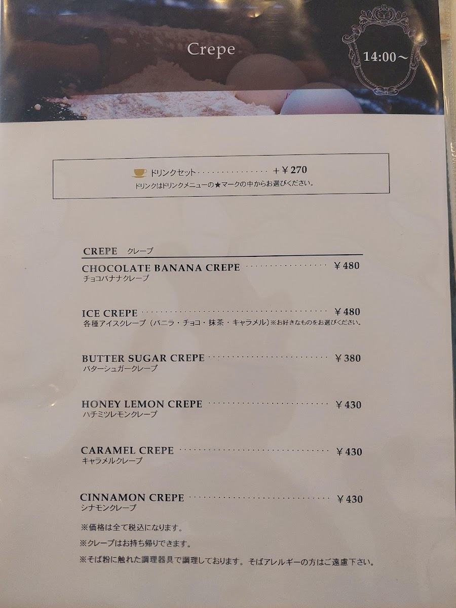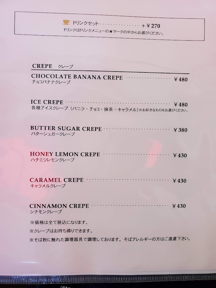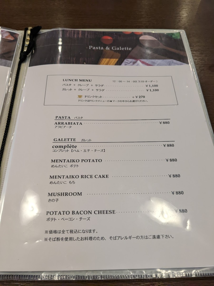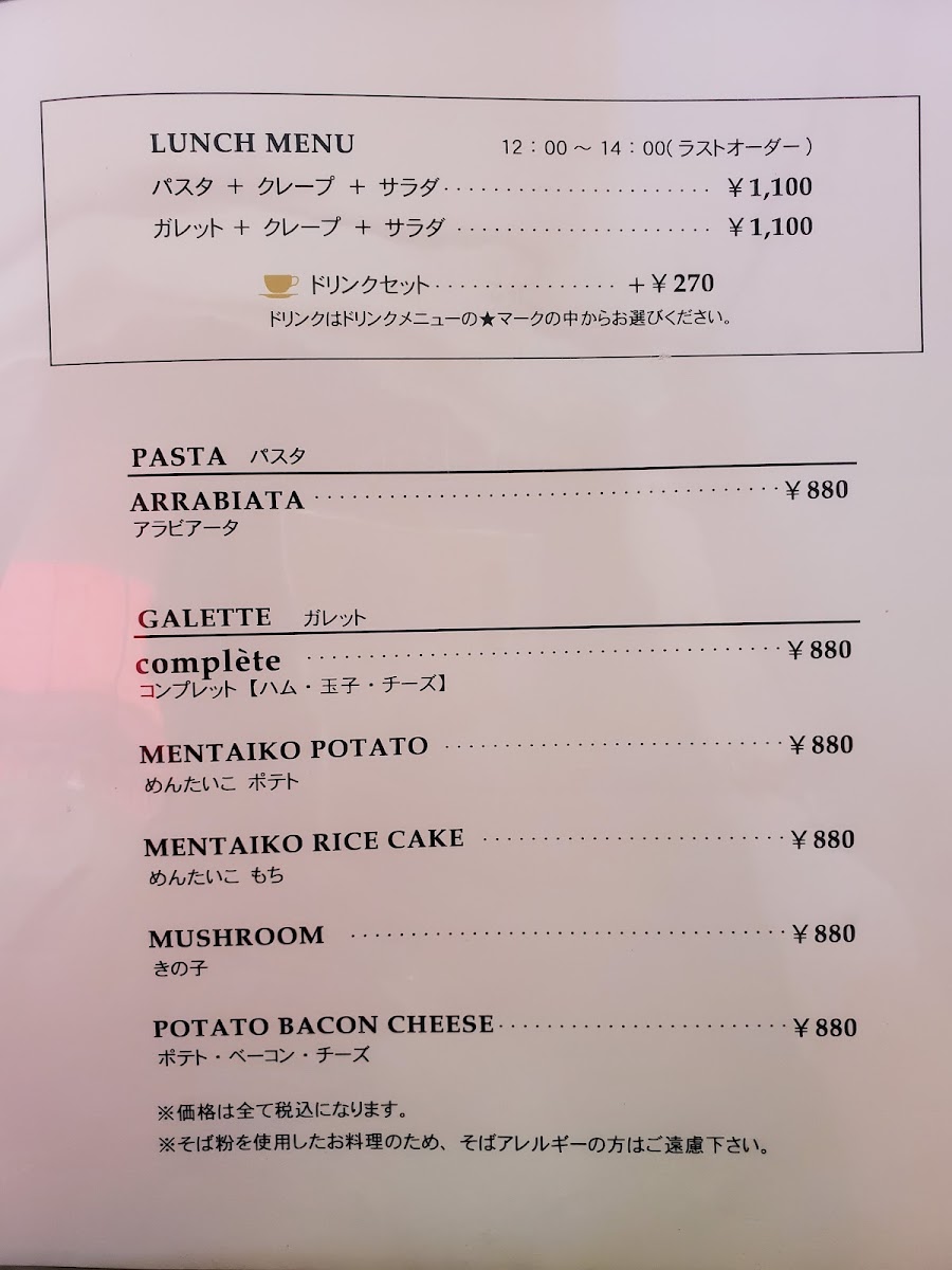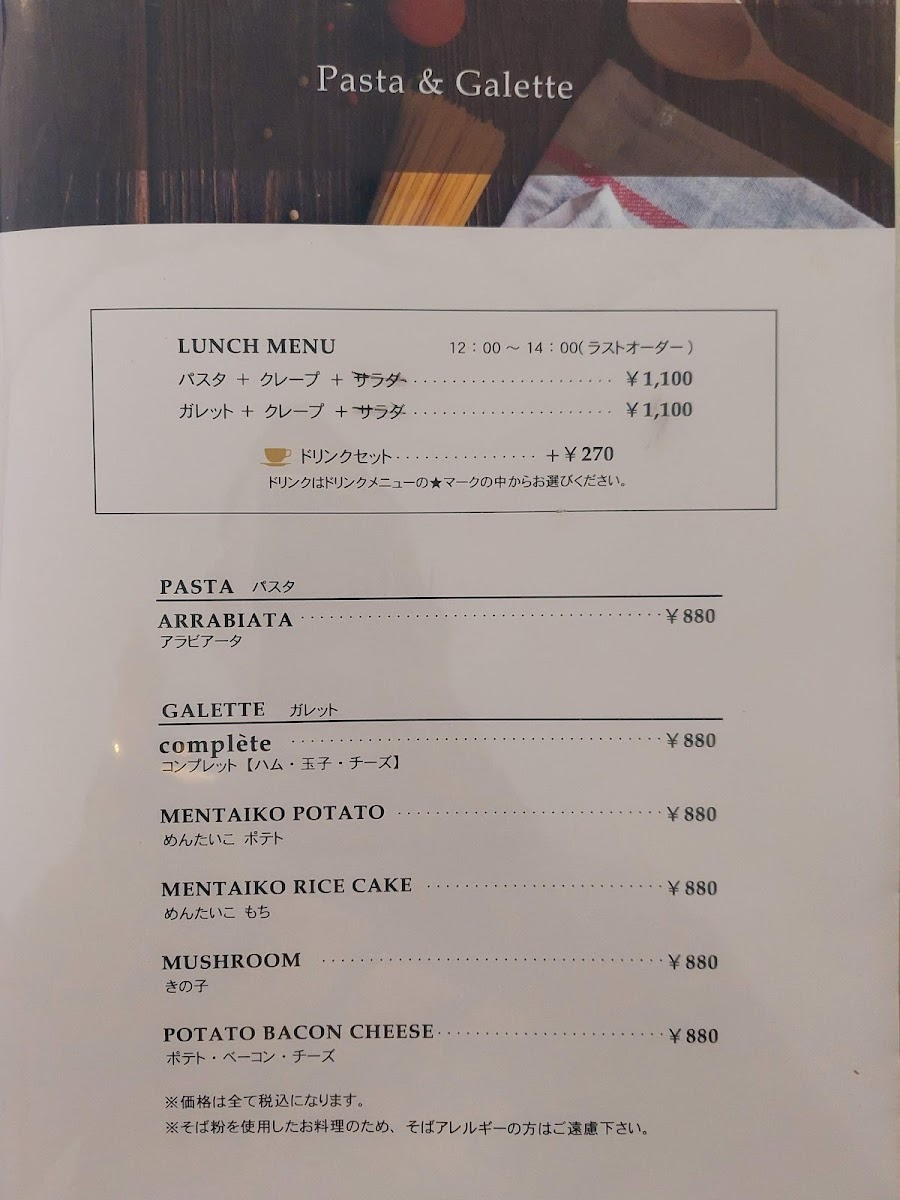 For breakfast or morning visits, there are specific offerings such as morning sets that combine crepes or galettes with coffee. Lunchtime features heartier options including savory galettes like the kinoko (mushroom) galette, pasta dishes such as penne arrabbiata, and fresh salads. Sweet crepes with different toppings, including butter sugar, honey lemon, cinnamon, and chocolate banana, are available throughout the day and pair with a selection of hot or iced coffee drinks, café au lait, and specialty coffees.
